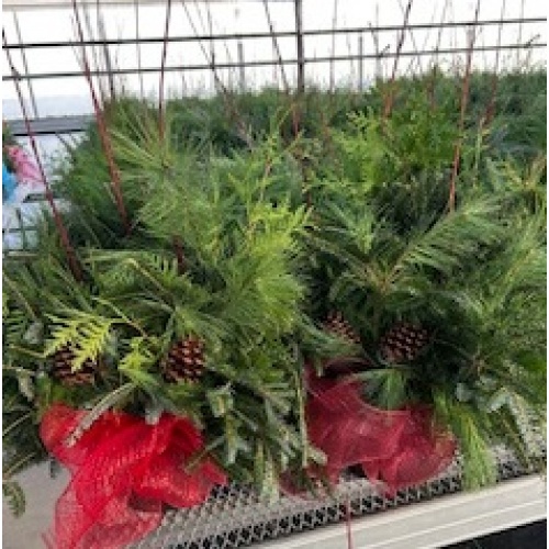 Assorted greenery with red dogwood, pine cones,Red or Burgundy Bow
